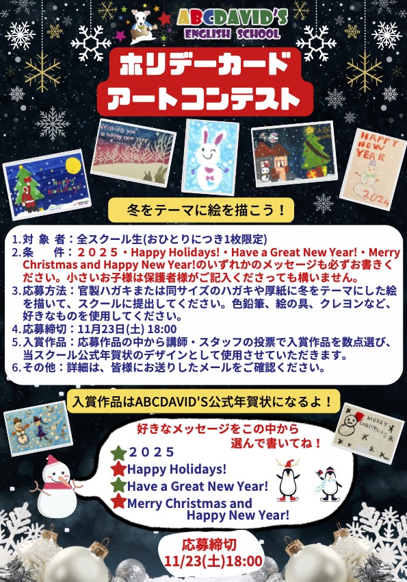 イベントホリデーカードアートコンテスト2024開催!! 対象者:全スクール生 終了しました!2025年度もお楽しみに 冬をテーマにした絵を描いてください♪ 入賞作品は2025年ABCDAVID'S英語スクールの公式ホリデーカード(年賀状)のデザインになります! TEL: 072-380-6818 クイックナビ トップ 保護者と生徒の声 よくあるご質問 お問い合わせ クラス スタンダードクラス バイリンガルクラス 英検・英検Jr. 宿題・生徒ページ スクール 寝屋川校 寝屋南校 摂津校 茨木校 アクセス